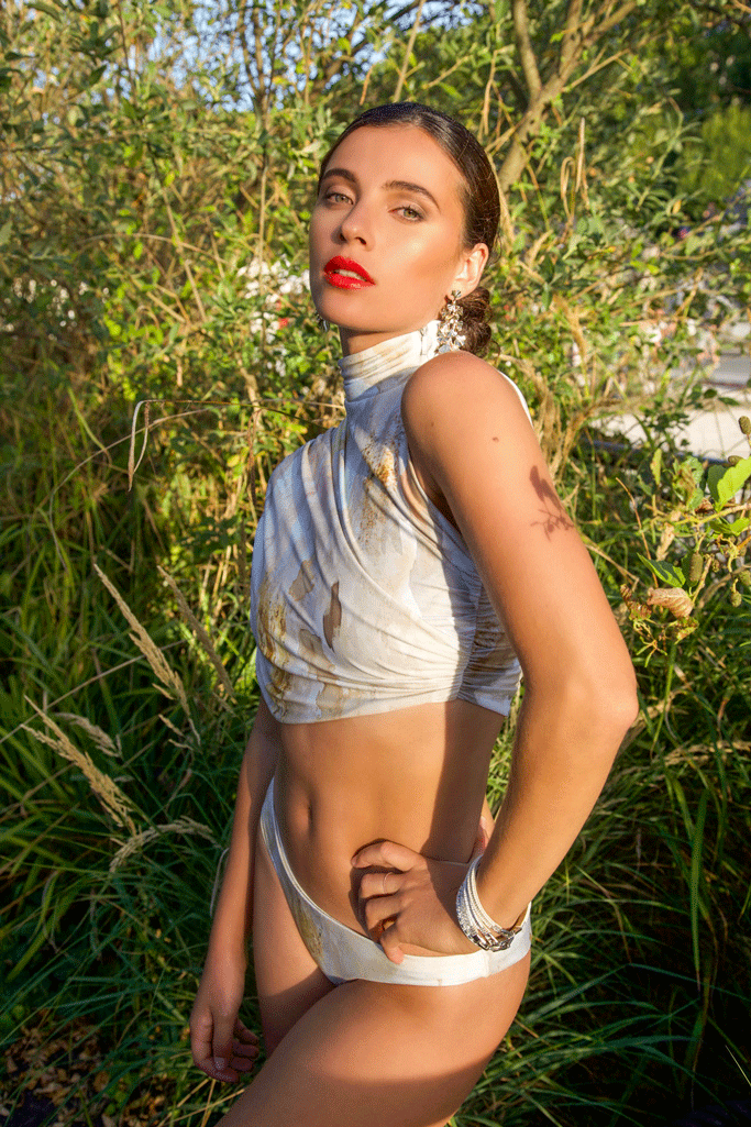 Elegant and refined bikini, with asymmetrical high neck, low-waisted tanga panties, watercolor print / It can be worn for a seaside event like a very beautiful piece of clothing Moderate coverage