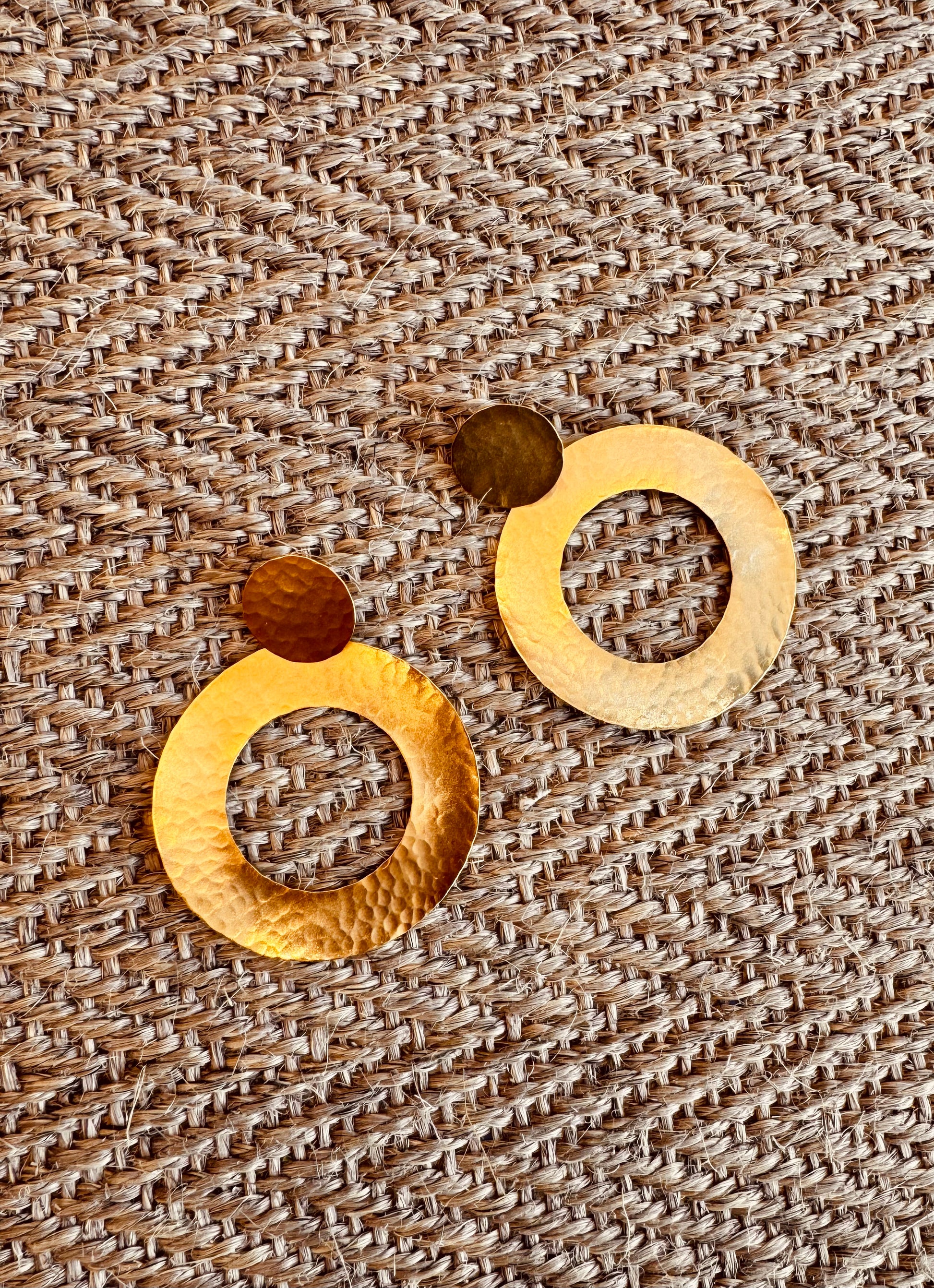 Adoptez une allure puissante avec ces boucles d'oreilles pendantes au design audacieux et contemporain. Leur forme géométrique distinctive présente l'alliance réussie d'une pastille et d'un large cercle, créant un mouvement captivant. La texture martelée unique de l'anneau attire la lumière et confère un éclat riche, ajoutant immédiatement du caractère à votre tenue.
