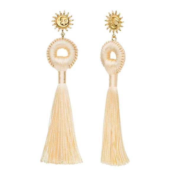 Les boucles d'oreilles Régina, en fil de soie et laiton plaqué or, apporteront une touche ensoleillée et brillante à vos tenues pour un look élégant et bohème à la fois.