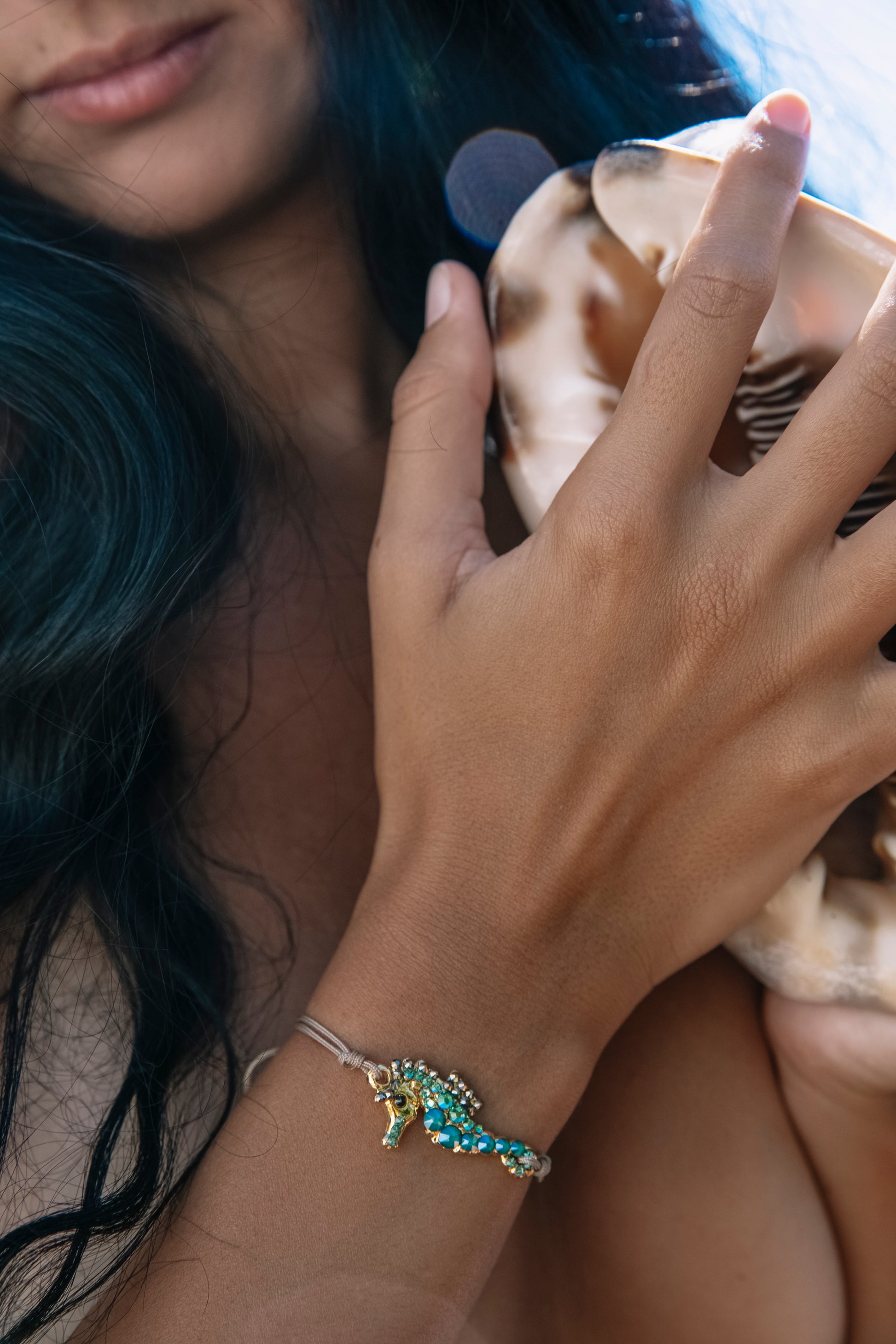 Seahorse bracelet with Swarovski crystals with cord. Adjustable size.