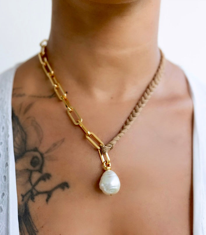 Collier élégant et original tressé à la main en polyester marron, chaîne plaquée or 18 carats et pépite de perle naturelle d'eau douce.