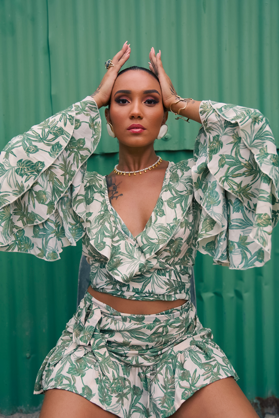 La jupe portefeuille CRÉMA séduit par sa fluidité et son imprimé végétal inspiré des paysages méditerranéens. Confectionnée en crêpe 100 %, elle épouse les courbes avec légèreté, tout en révélant subtilement la jambe à chaque pas. Sa coupe asymétrique et son nouage délicat à la taille soulignent la féminité avec justesse.