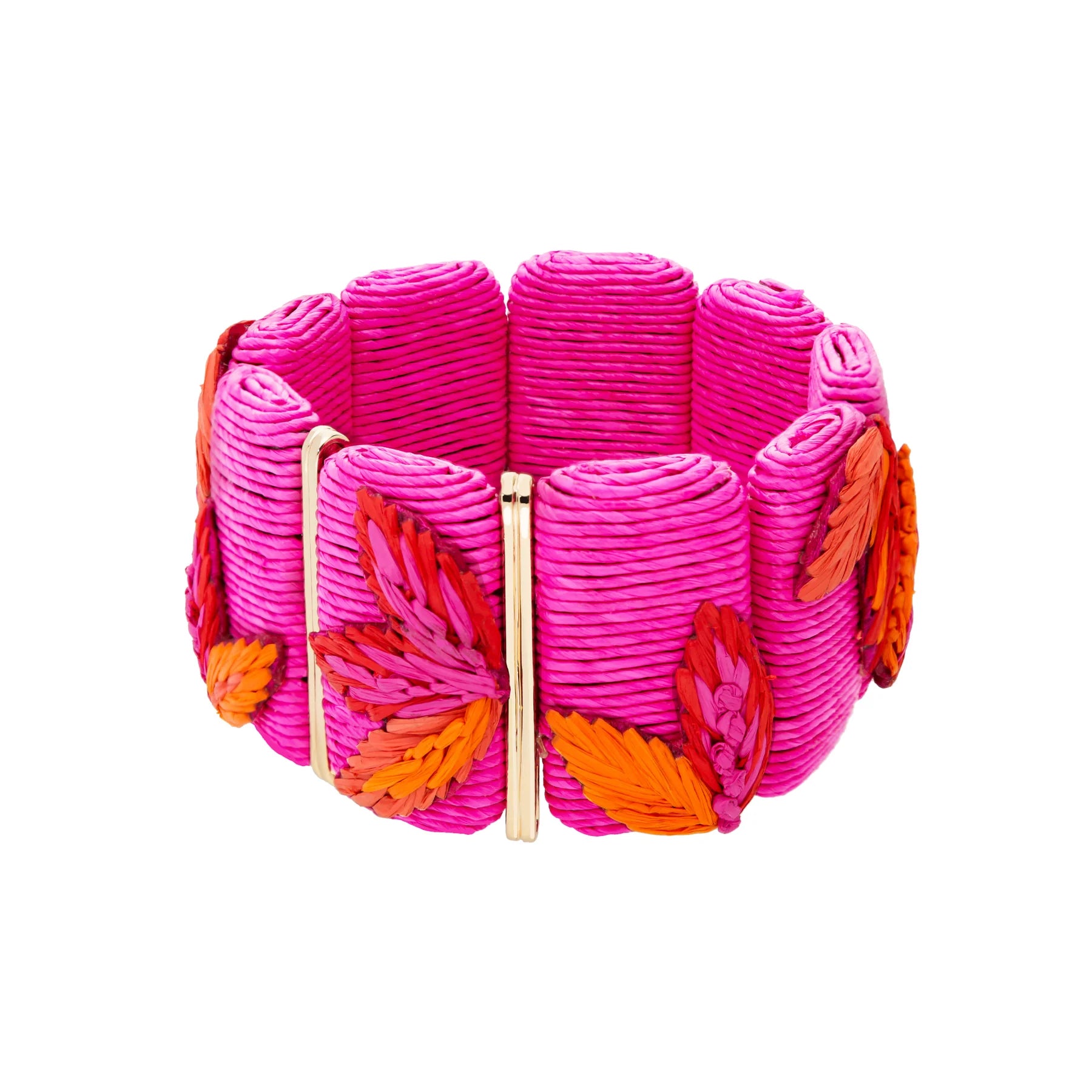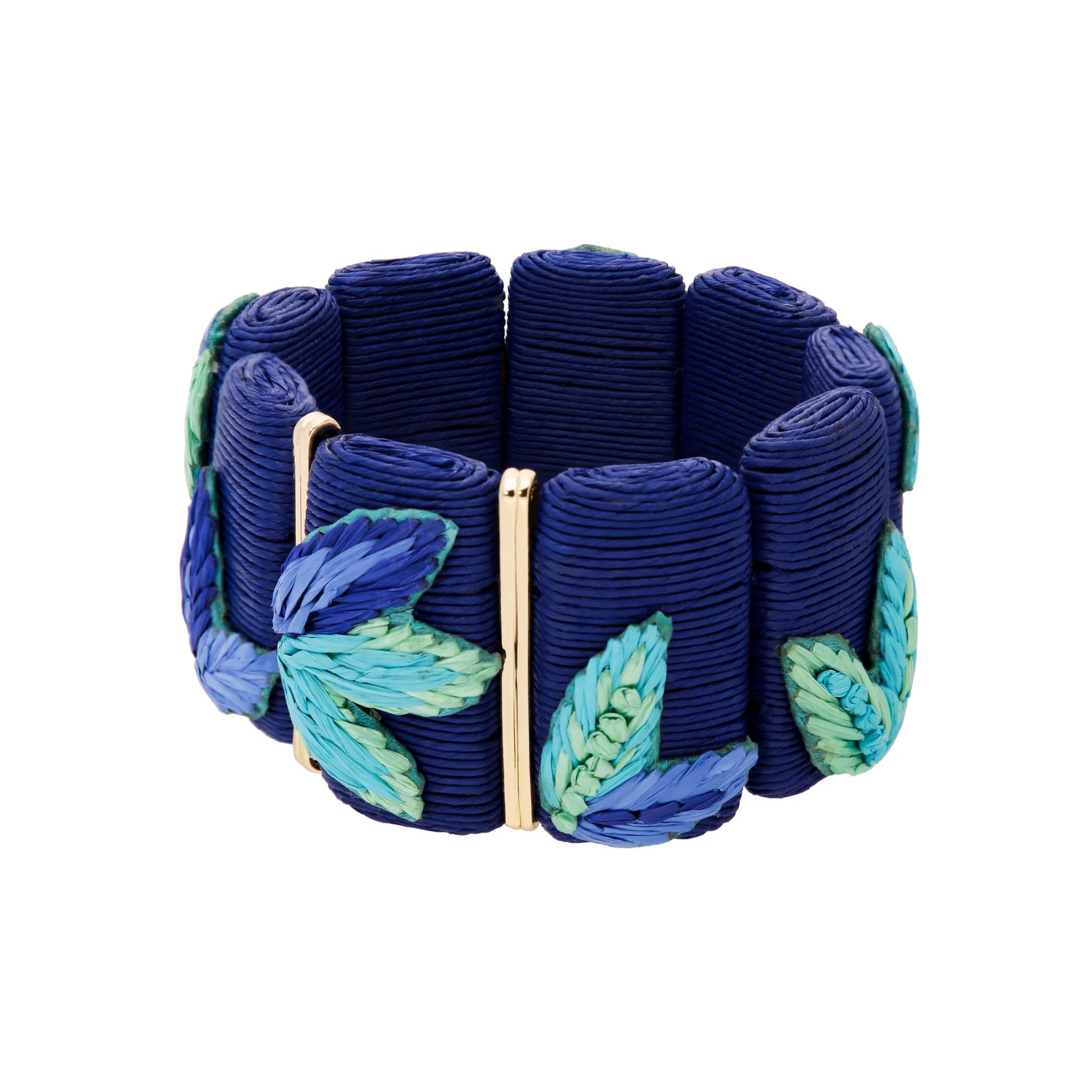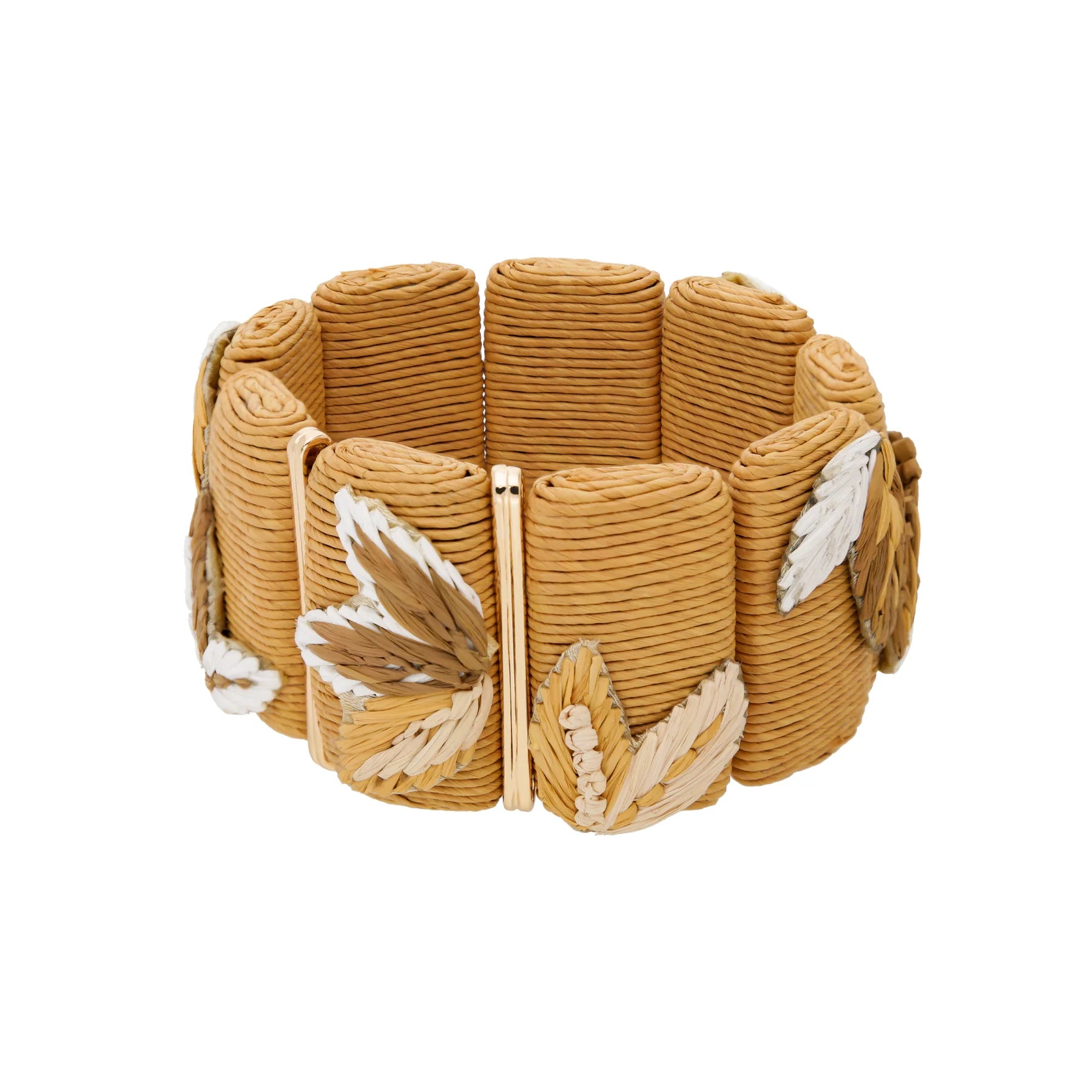 Composition : raphia tissé, laiton plaqué or et fil élastique.