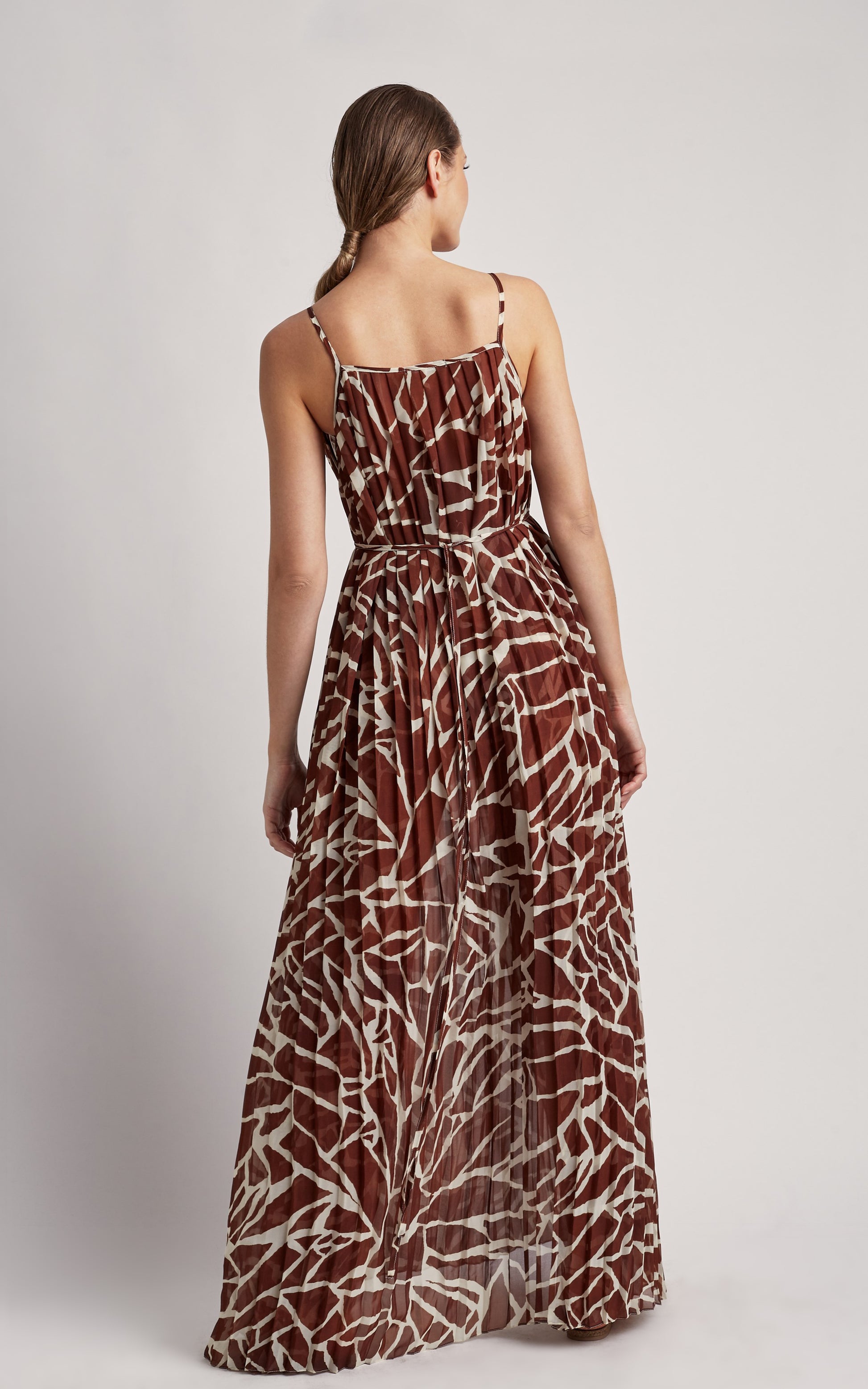 Long adjustable pleated dress with ties on the sides, color Giraffe, from the limited edition Lenny Niemeyer collection.