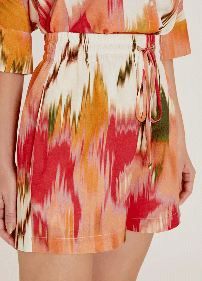 The Aral print features shades of pink on a linen-textured fabric. The shorts have an elastic waistband and a tunnel with a self-fabric tie for adjustment. This piece offers comfort and is perfect for everyday occasions. Pair it with the sleeveless shirt in the same print for an elegant set.