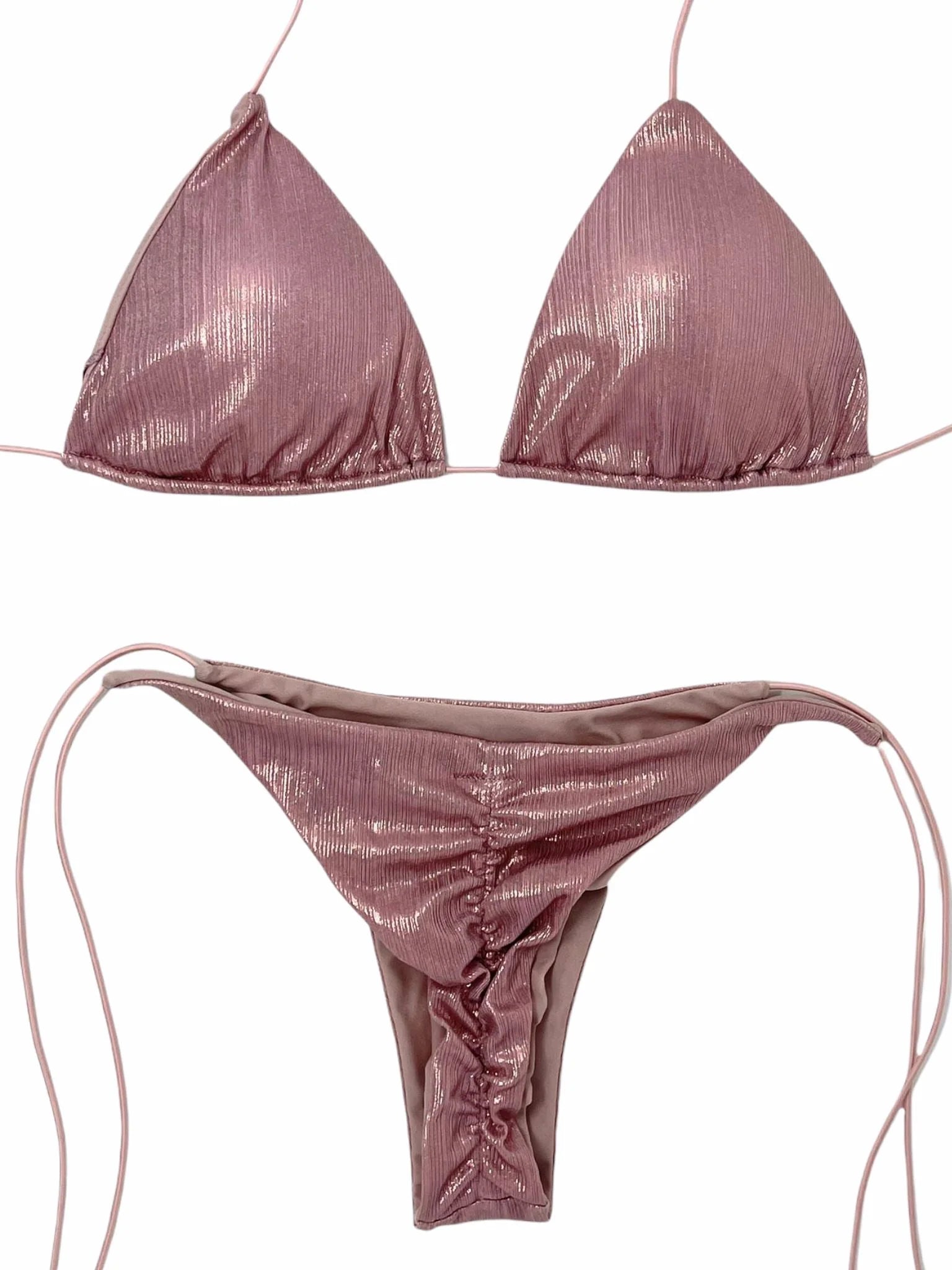 Le haut triangle coulissant épouse la poitrine avec élégance, tandis que le bas taille haute dessine une silhouette féminine et harmonieuse. Une pièce pensée pour celles qui aiment briller avec subtilité, entre mystère et lumière — parfaite pour les pool parties, les escapades en bord de mer ou toute occasion où l’on veut rayonner sans effort.