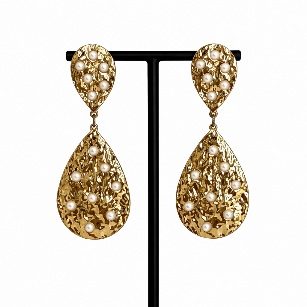 Ces boucles d’oreilles pendantes en métal doré et argenté se composent de deux segments en forme de goutte, à la texture martelée et ornés de perles blanches nacrées. Le contraste entre les tons dorés et argentés apporte une touche sophistiquée et lumineuse. Leur design évoque un style vintage revisité, élégant et affirmé.