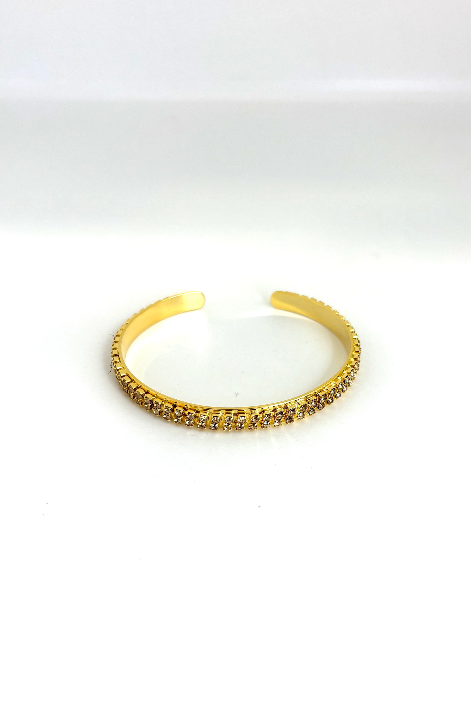 Minimaliste et sophistiqué, ce jonc ouvert se distingue par sa ligne épurée et sa finition brillante. Forgé dans un alliage de bronze, puis délicatement plaqué or, il révèle une texture lisse ponctuée d’une rangée de pierres scintillantes qui captent la lumière avec subtilité. Ce contraste entre la chaleur du métal doré et la clarté des pierres crée un équilibre parfait entre modernité et classicisme.