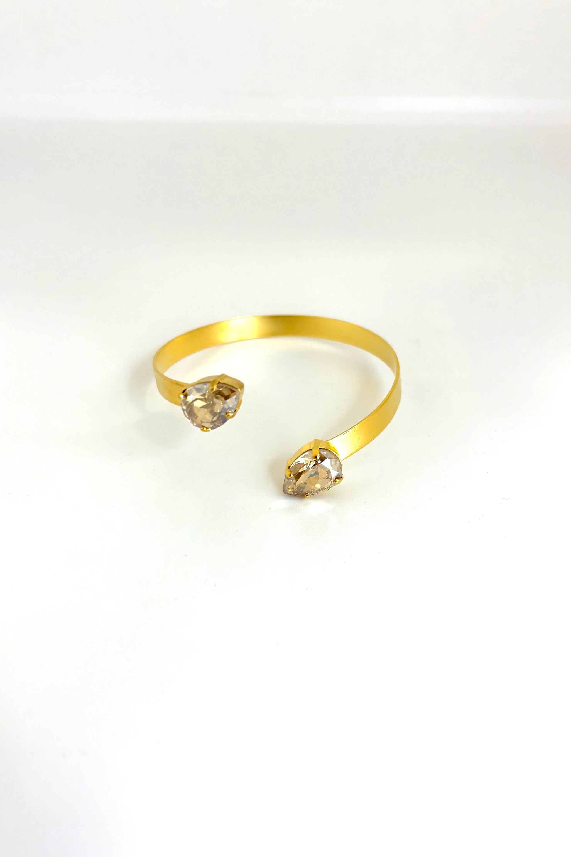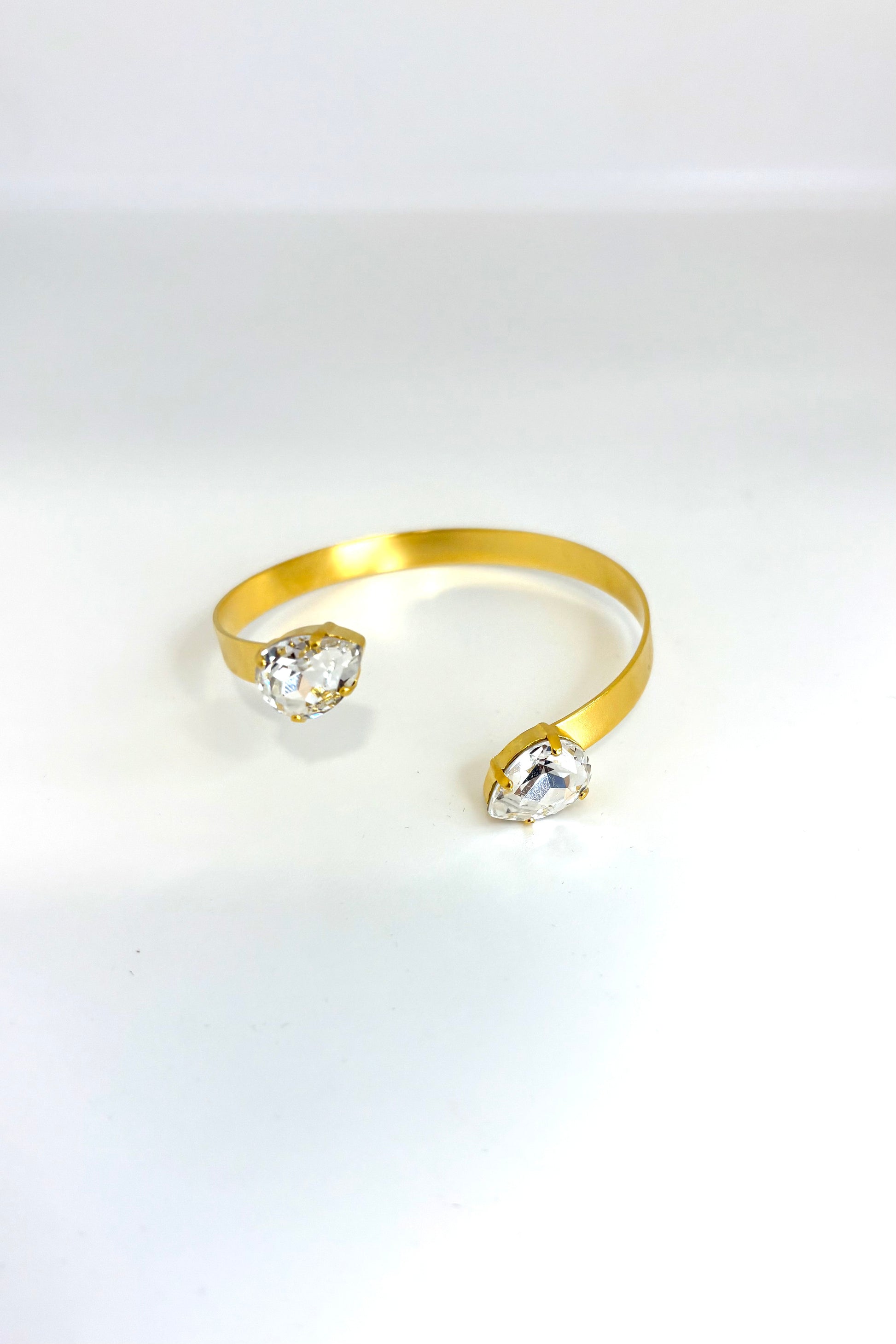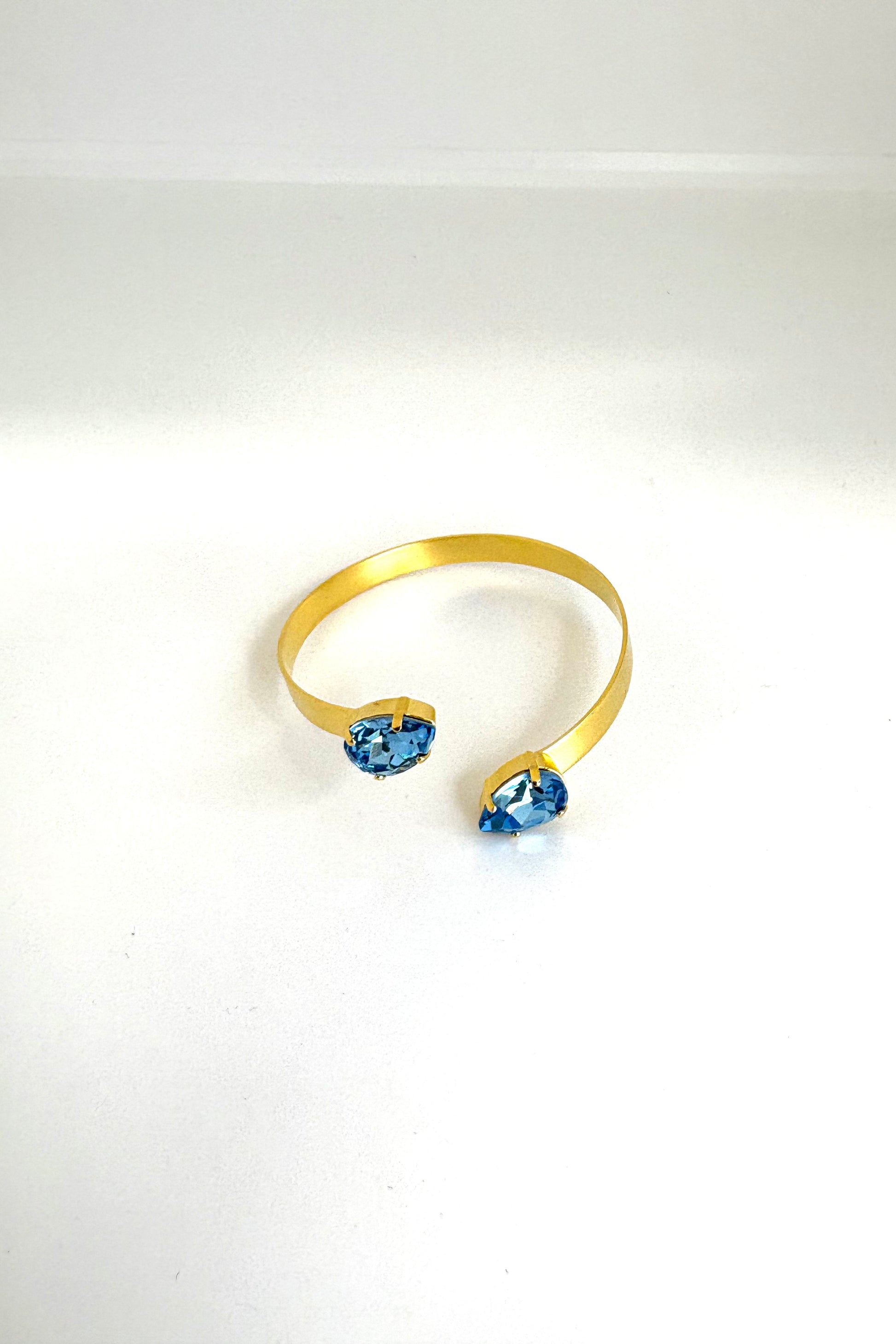 Forgé dans un alliage de bronze et plaqué or, ce bracelet combine robustesse et finesse. Sa forme ouverte permet un ajustement confortable au poignet, tout en conservant une silhouette structurée et moderne. Les pierres, taillées avec précision, captent la lumière et ajoutent une note scintillante sans excès.