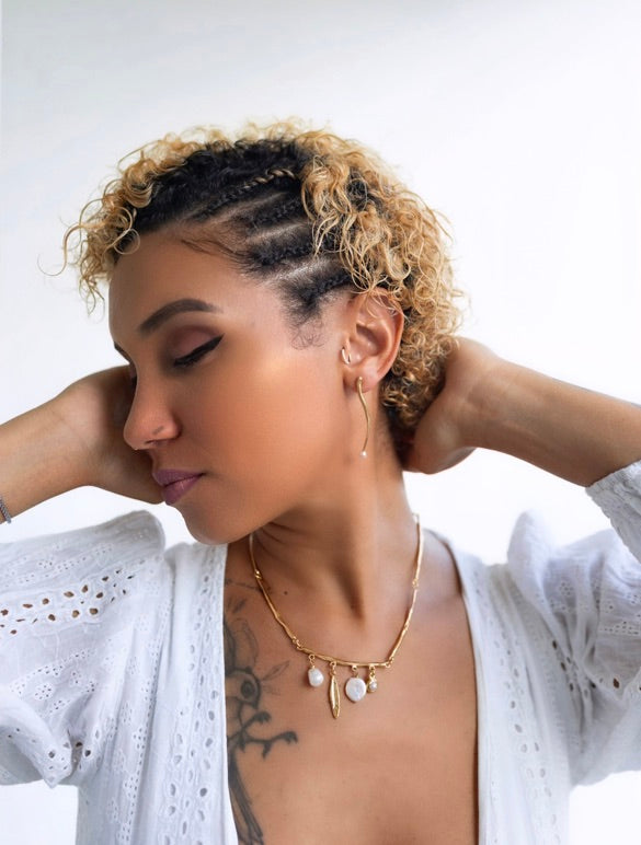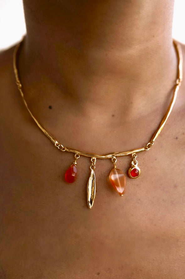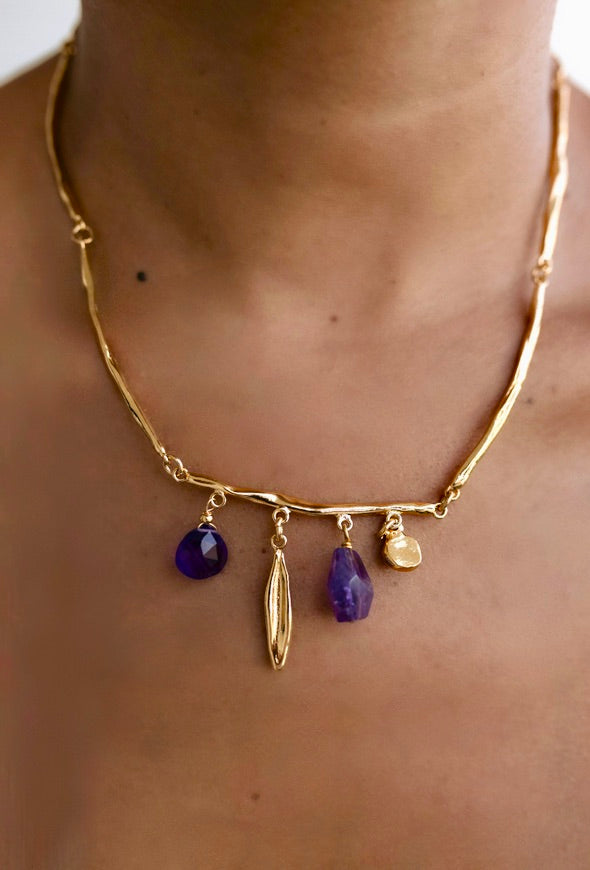 Collier court élégant et original en chaîne plaquée or 18 carats et pierres semi-précieuses, Améthyste, Cornaline ou Perles d'eau douce.