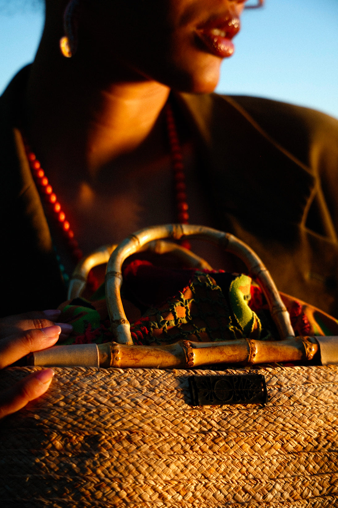 Panier en paille avec anses en bambou, entièrement doublé intérieurement, comportant une fermeture en tissu avec lien de serrage.